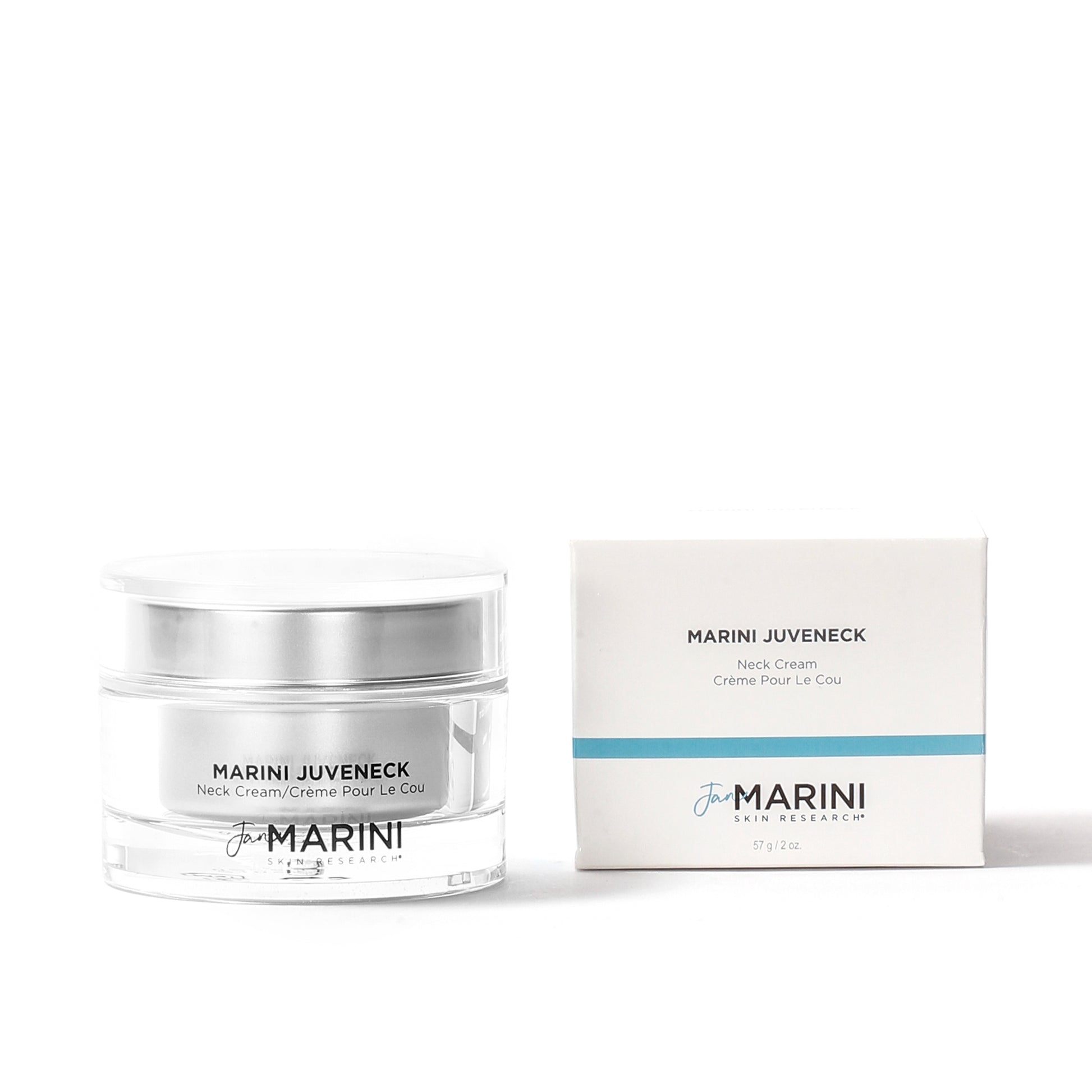 Marini Juveneck is a revolutionary neck cream that helps to increase skin hydration and decrease the appearance of uneven texture, wrinkles, and discoloration on the neck. 13 key ingredients including glaucine, aminophylline, peptides and hyaluronic acid help restore a youthful appearance. In a study published in the Journal of Drugs & Dermatology1 , Marini Juveneck was shown to significantly improve satisfaction with hydration, texture, wrinkles and laxity with extremely high satisfaction and 94% of subjects noting improvement in one or more categories.